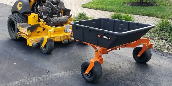 Kart Mate is an articulating kart that mounts to a zero turn or stander mower you already own. Kart Mate can carry 500 lbs and allow you to travel at the top speed of your mower. The tub can be dumped forward and the entire kart can be lifted vertically on the mower to take up as little space as possible on your trailer. The front casters can also fold in so you can pass through small gates.